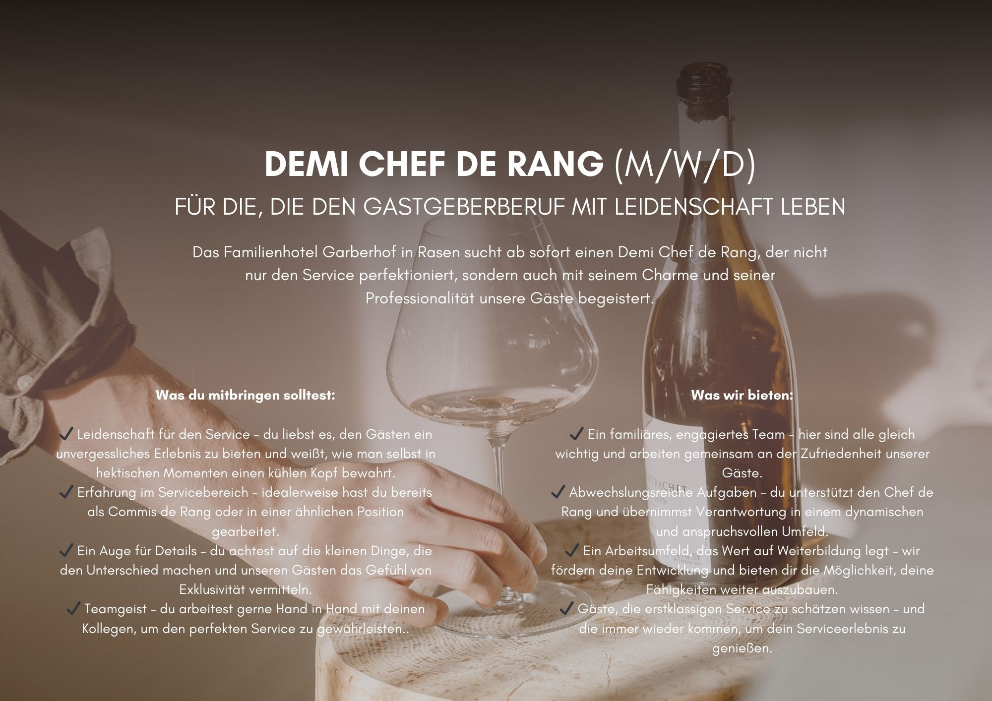 Das Familienhotel Garberhof in Rasen sucht ab sofort einen Demi Chef de Rang, der nicht nur den Service perfektioniert, sondern auch mit seinem Charme und seiner Professionalität unsere Gäste begeistert.