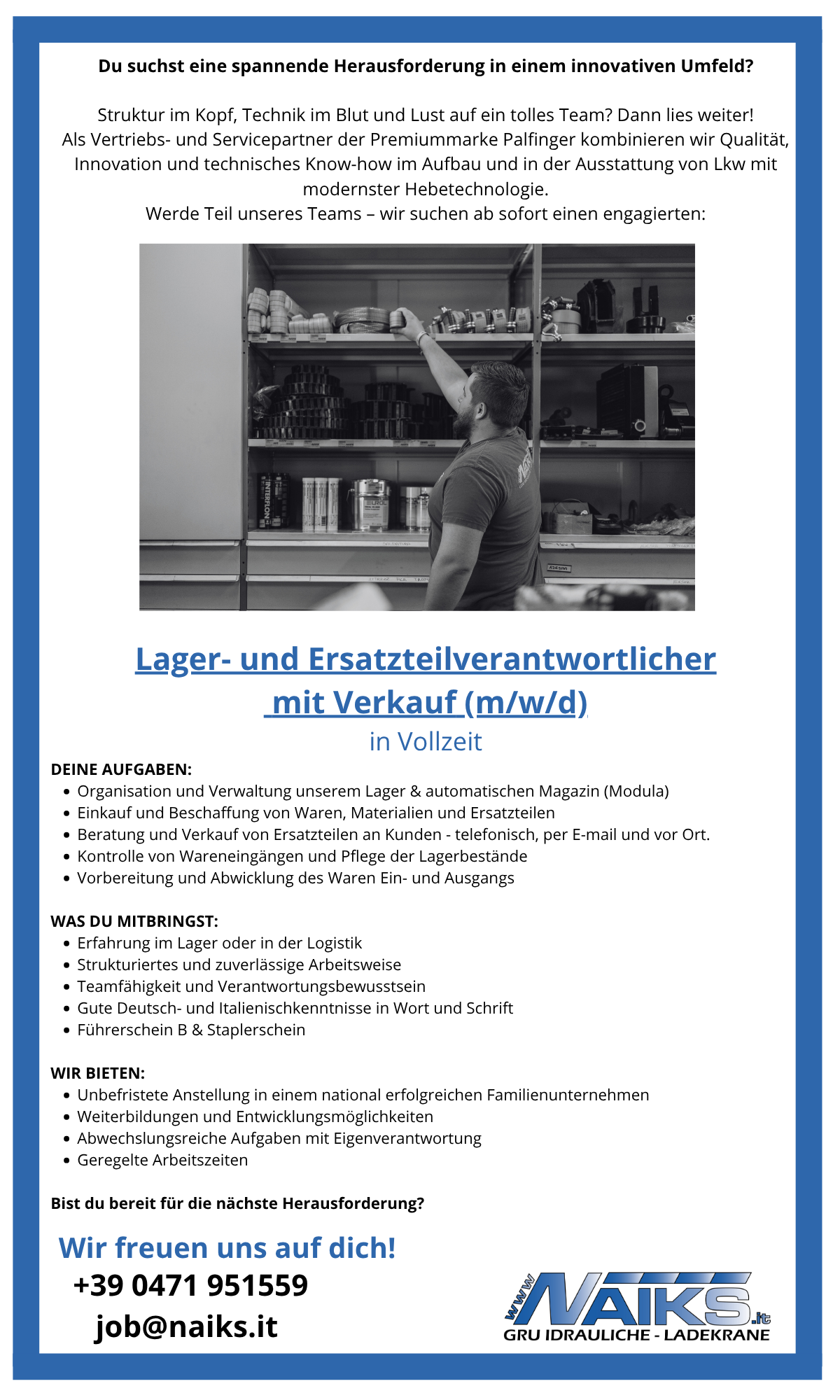 Lager- und Ersatzteilverantwortlicher mit Verkauf (m/w/d)