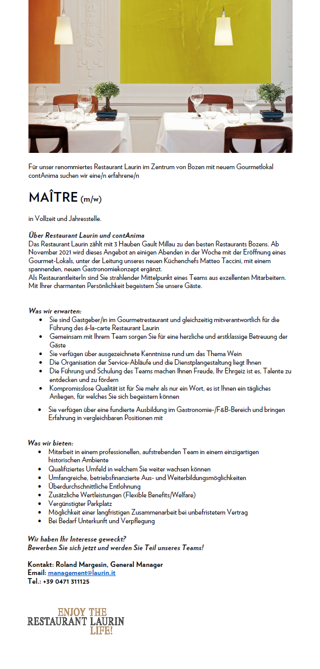 Für unser renommiertes Restaurant Laurin im Herzen von Bozen – ausgezeichnet mit 2 Hauben von Gault Millau – und unser neues Gourmetlokal ConTanima, suchen wir ab sofort eine/n leidenschaftliche/n