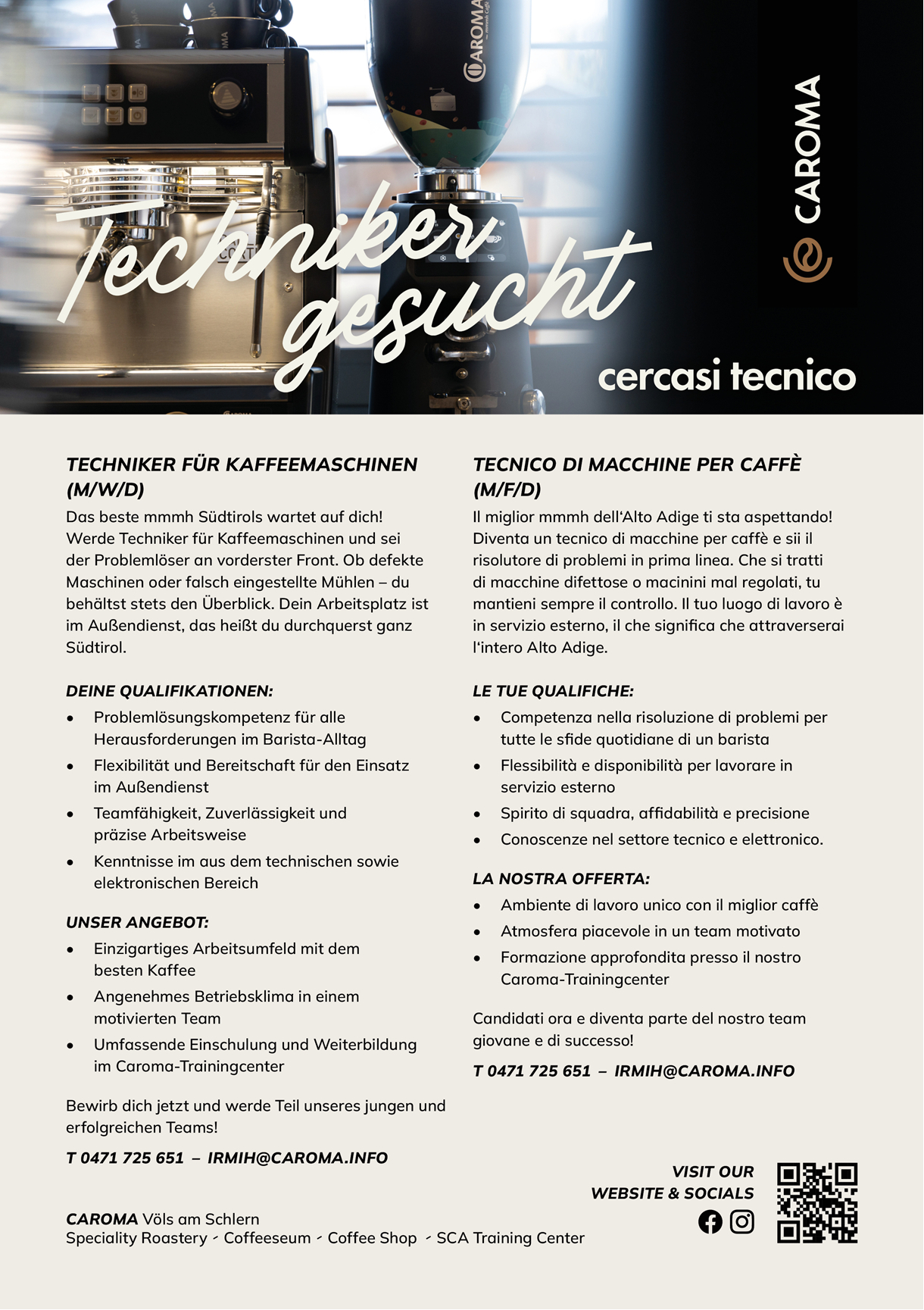 Das beste mmmh Südtirols wartet auf dich! Werde Techniker für Kaffeemaschinen und sei der Problemlöser an vorderster Front. Ob defekte Maschinen oder falsch eingestellte Mühlen – du behältst stets den Überblick. Dein Arbeitsplatz ist im Außendienst, das heißt du durchquerst ganz Südtirol.