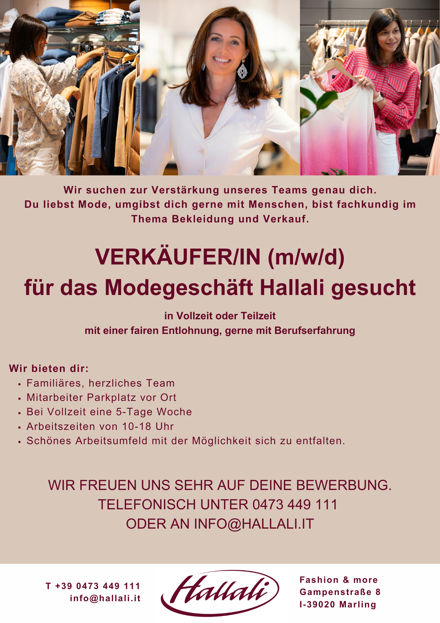 Du liebst Mode, umgibst dich gerne mit Menschen, bist fachkundig im Thema Bekleidung und Verkauf.